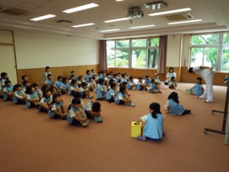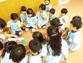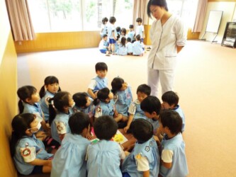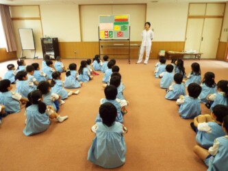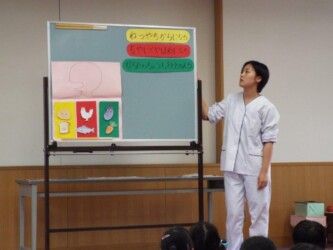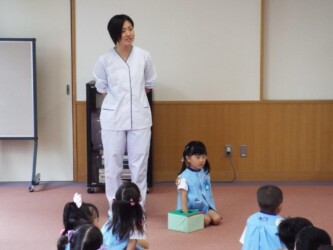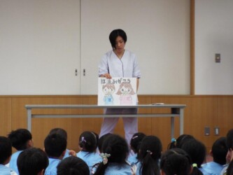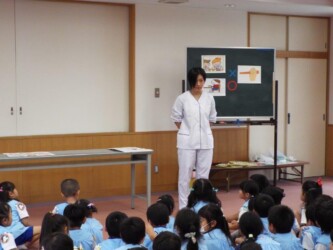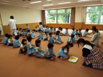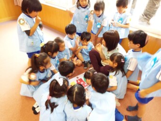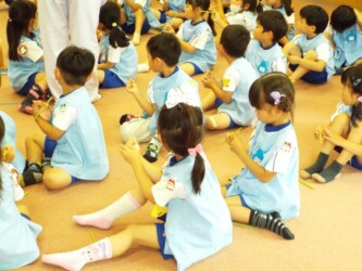 マナークイズをしたり、正しいおはしの持ち方を教えてもらい、豆つかみリレーにも挑戦しました。最後は、「歯を磨こう」という紙芝居を見て、歯磨きの大切さを学びました。