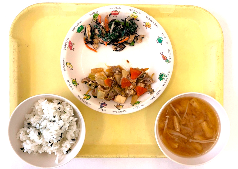 わかめごはん・すき焼き風煮物・ひじきのゴマ和え・大根と油揚げのみそ汁
