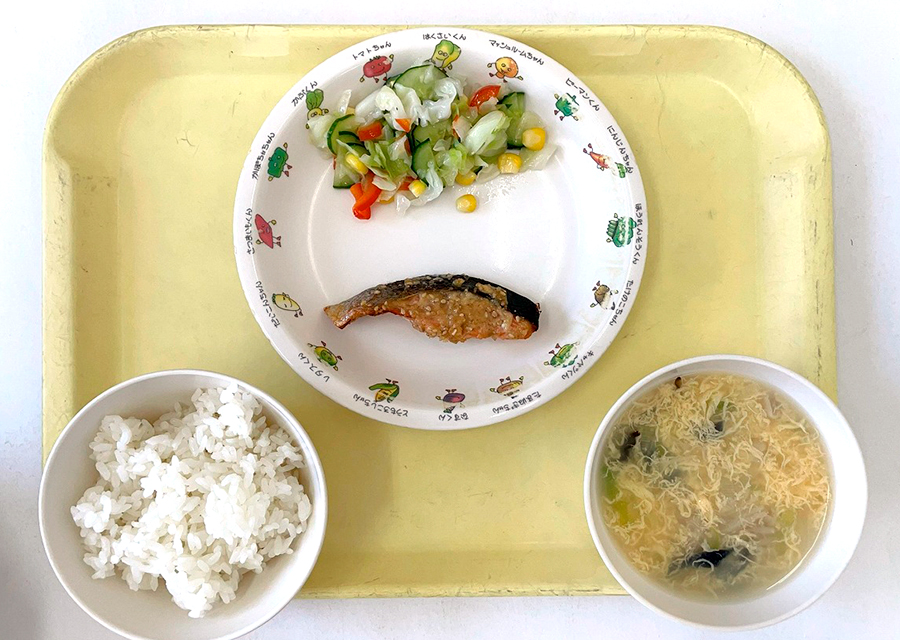 ごはん・鮭のゴママヨ焼き・イタリアンサラダ・たまごスープ