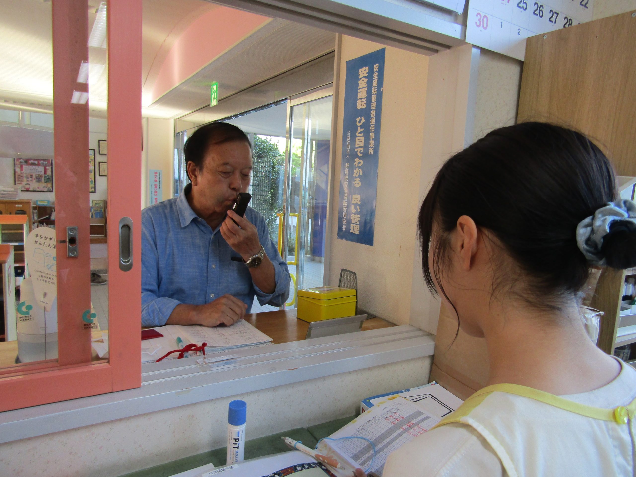 出発前 車両の日常点検及び定期点検を確実に行い、良好な状態を維持しています。運転手の健康状態の確認及びアルコールの濃度チェックを行います。