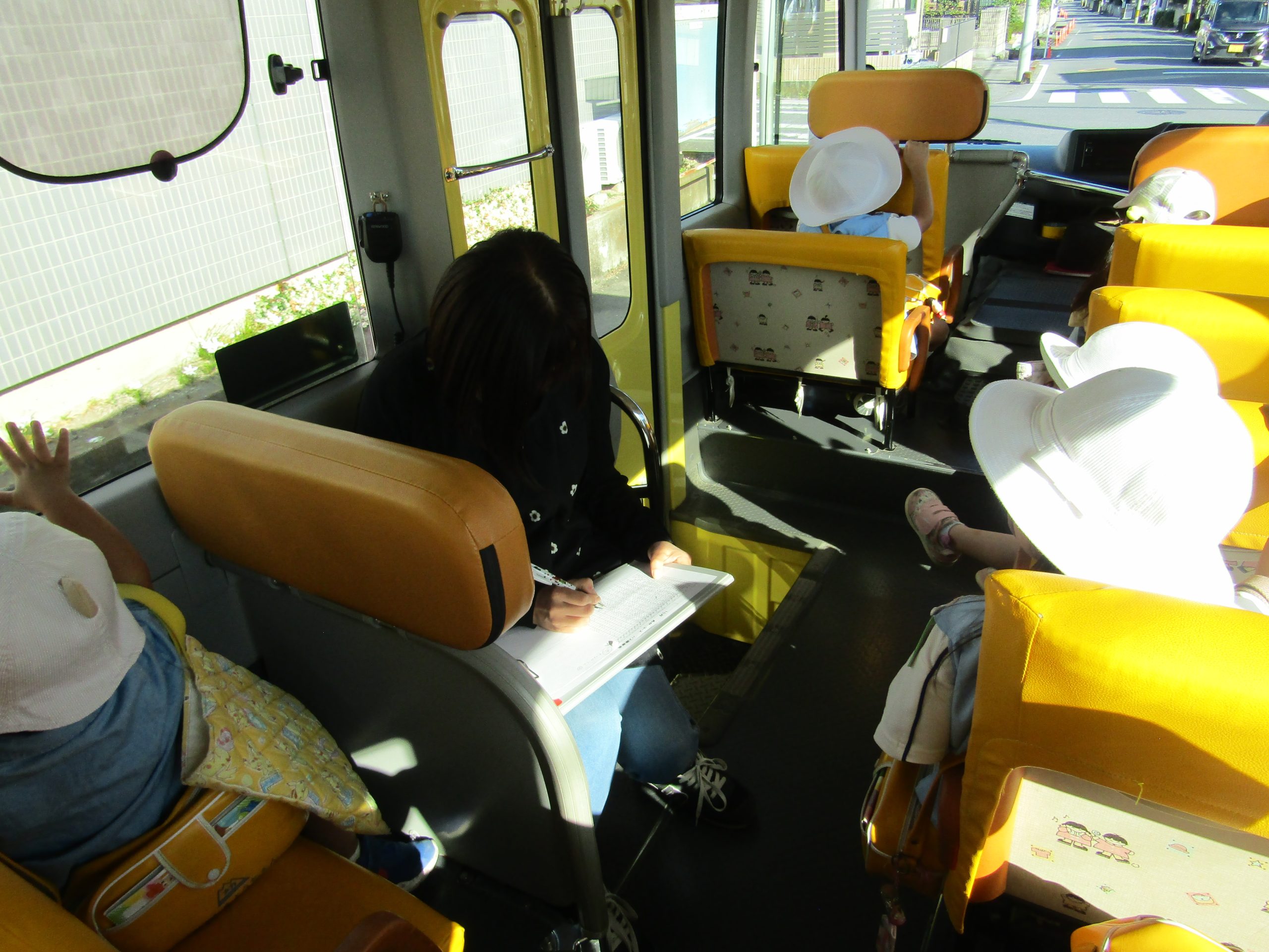 乗降車確認 バスには、運転手の他に常勤の先生が添乗します。先生は、バスを利用する園児を把握し、園児の乗車及び降車の確認をします。また、無線機で園と連絡をとり、最新の情報を把握します。