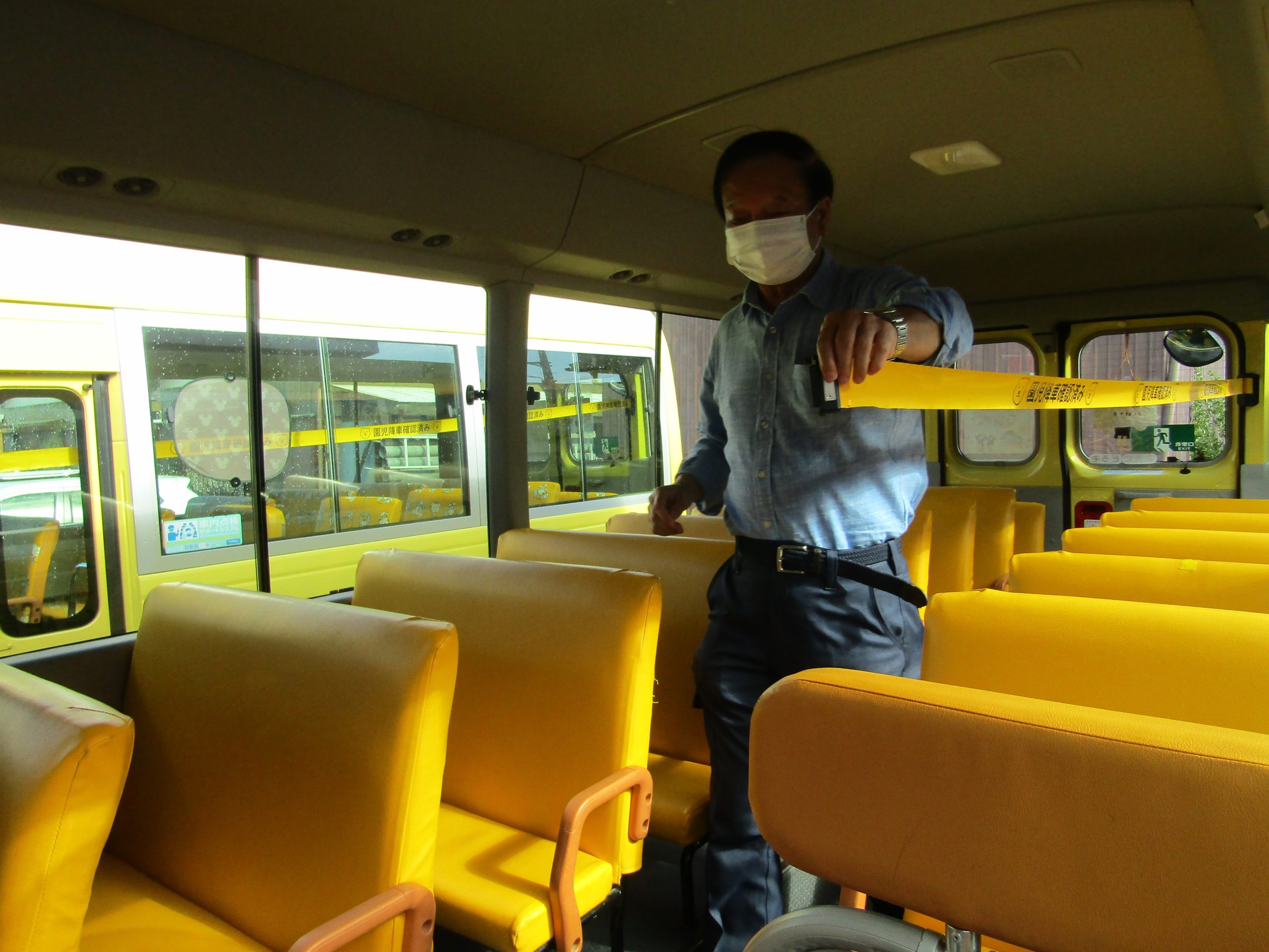 その後、運転手が再度確認をし、座席後方の車内置き去り防止安全装置の確認ボタンを押します。全ての確認が終了後、車外からも確認した事が分かるよう「園児降車確認済み」の目印をします。