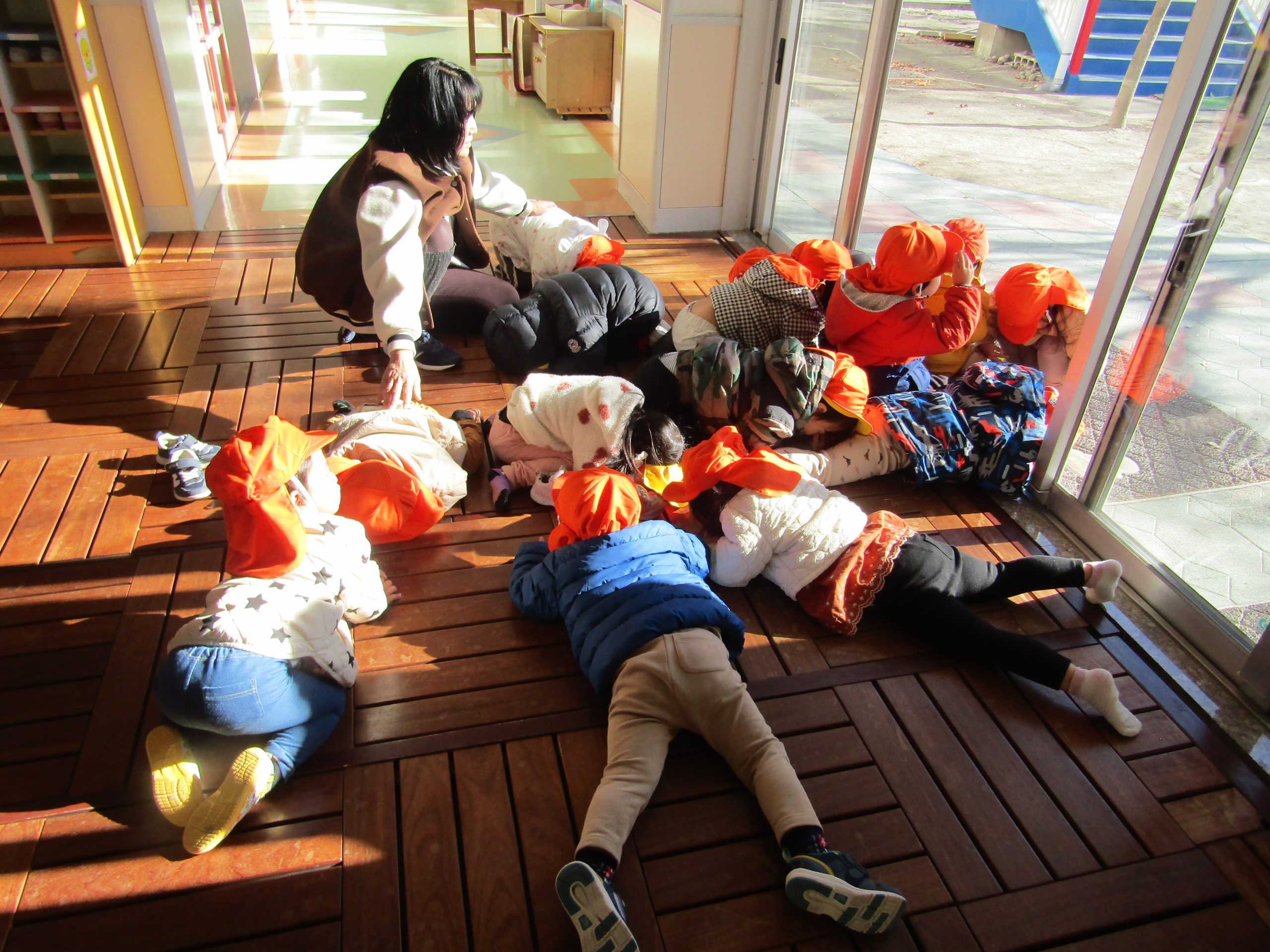 2026年1月9日 地震避難訓練 今年度最後の地震避難訓練。放送が始まると、しっかり耳を傾け先生と一緒に園庭の真ん中に避難しました。 玄関では、外に出ようとしていたひよこ組の子ども達がだんごむしの姿勢でじっとしていました。 みんなすごい!!さすがです!日頃の訓練の賜物ですね!
