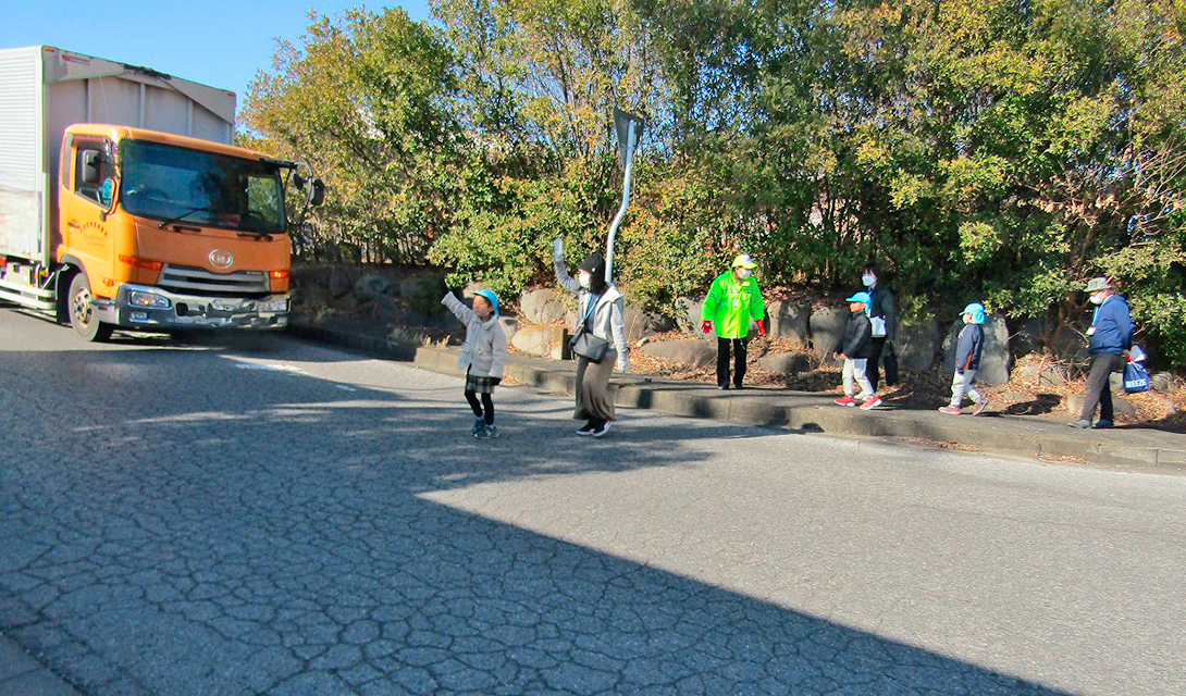 今回は、子どもが前を歩き保護者の方が後ろから見守る形で園外歩行訓練を行いました。