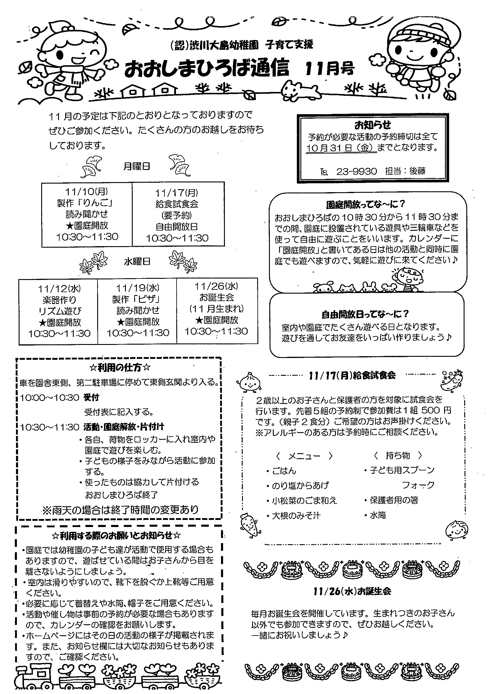 | 11月17日(月) | 給食試食会(要予約)・自由開放:10:30〜11:30 |