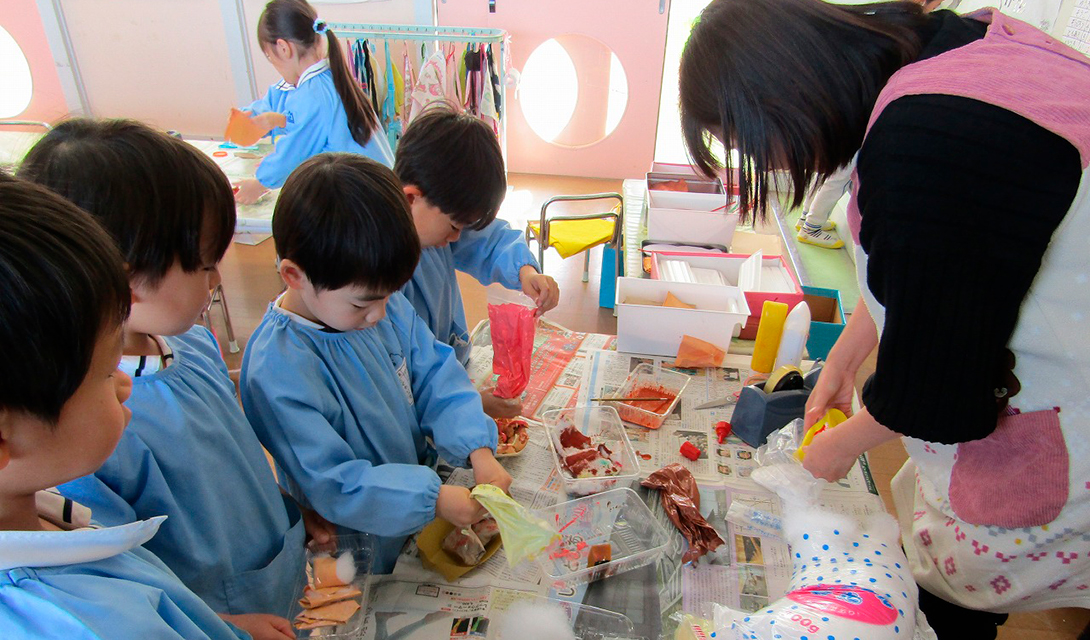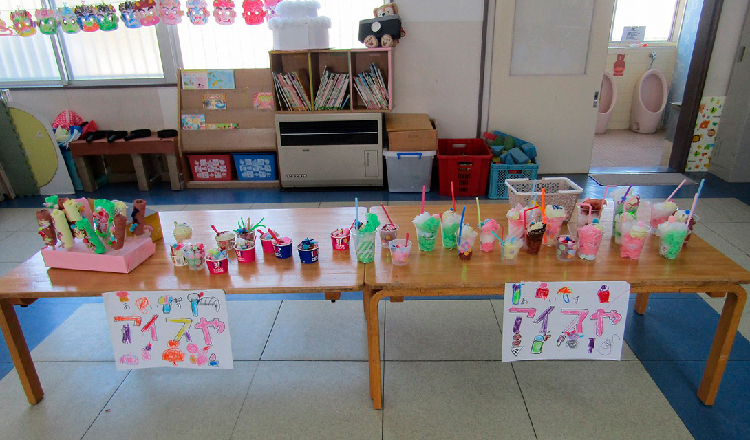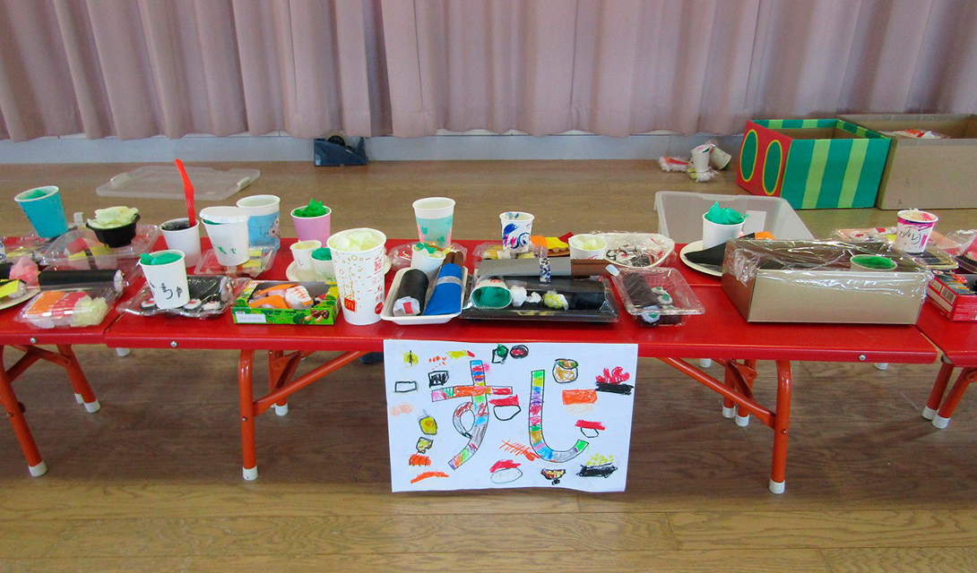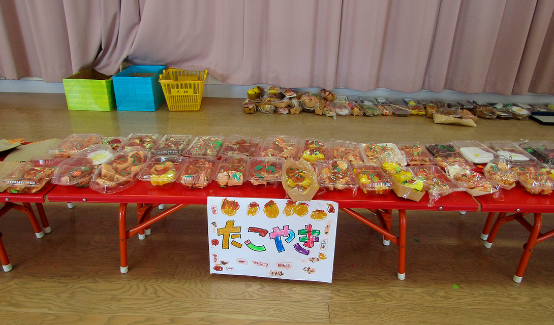 おおしまようちえんのお店屋さんごっこは、4日間をかけておすし屋さん、たこやき屋さん、ペット屋さん、カフェ屋さんに分かれて品物作りから販売までやります!
