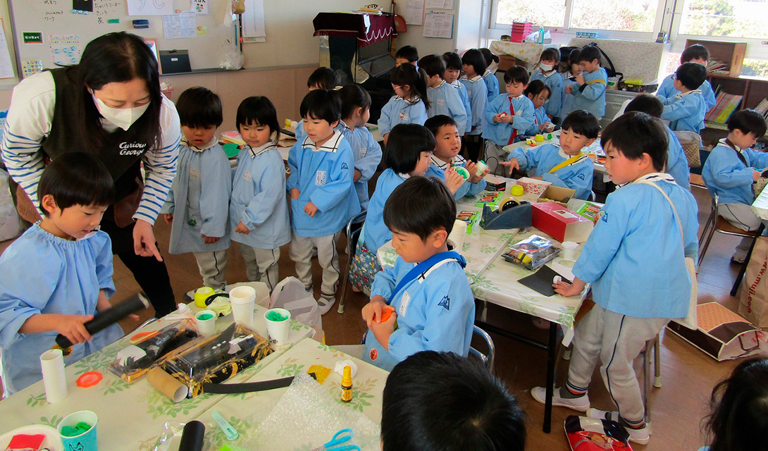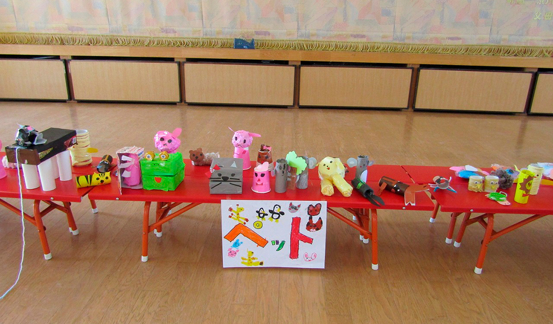 園長先生の話を聞き、各学年の製作物の紹介をしました。