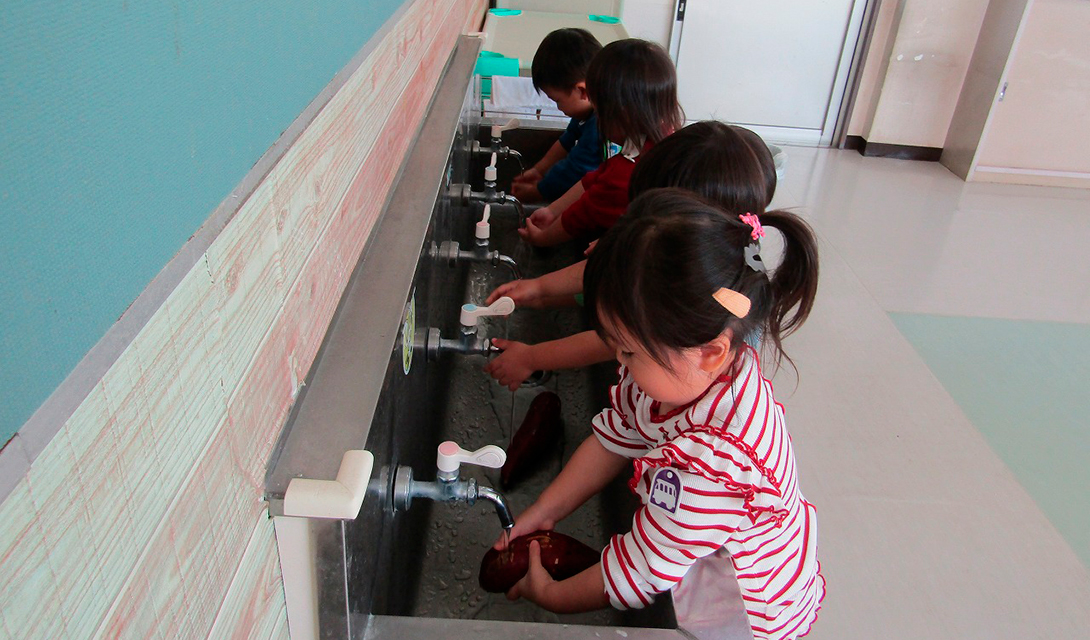 今日は子ども達が楽しみにしていたさつまいものおやつ作り体験♪子ども達は前日にクラスでさつまいもを洗って準備をしています。