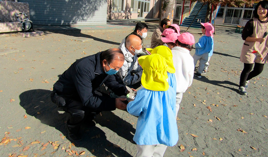 隊員の方から講評を頂いた後は、年長さんから勤労感謝のプレゼントを渡しました!その後、消防車の見学と隊員の方が持参してくれた制服を着て記念撮影会をしました。子ども達にとっては、夢のような時間だったようです♪