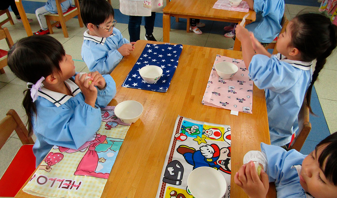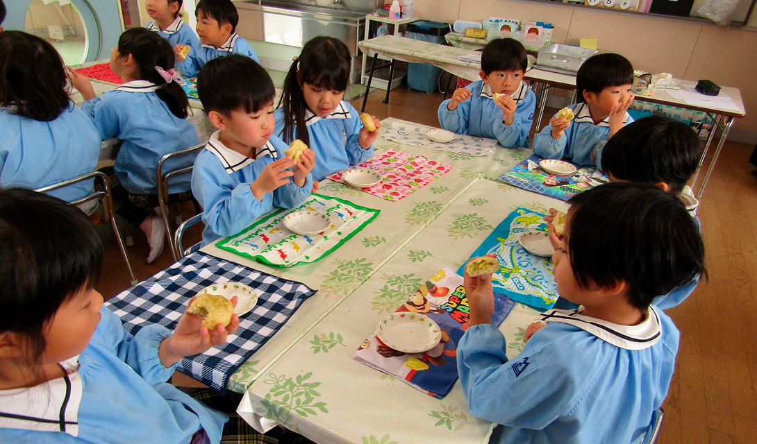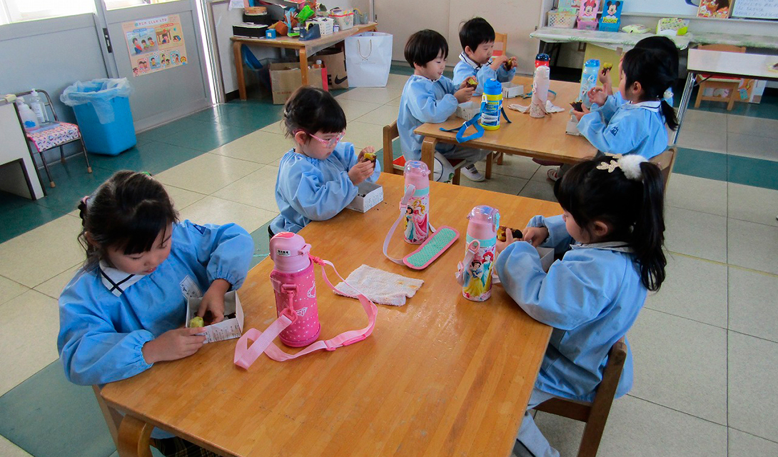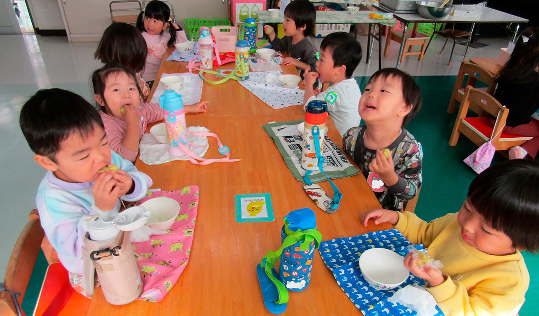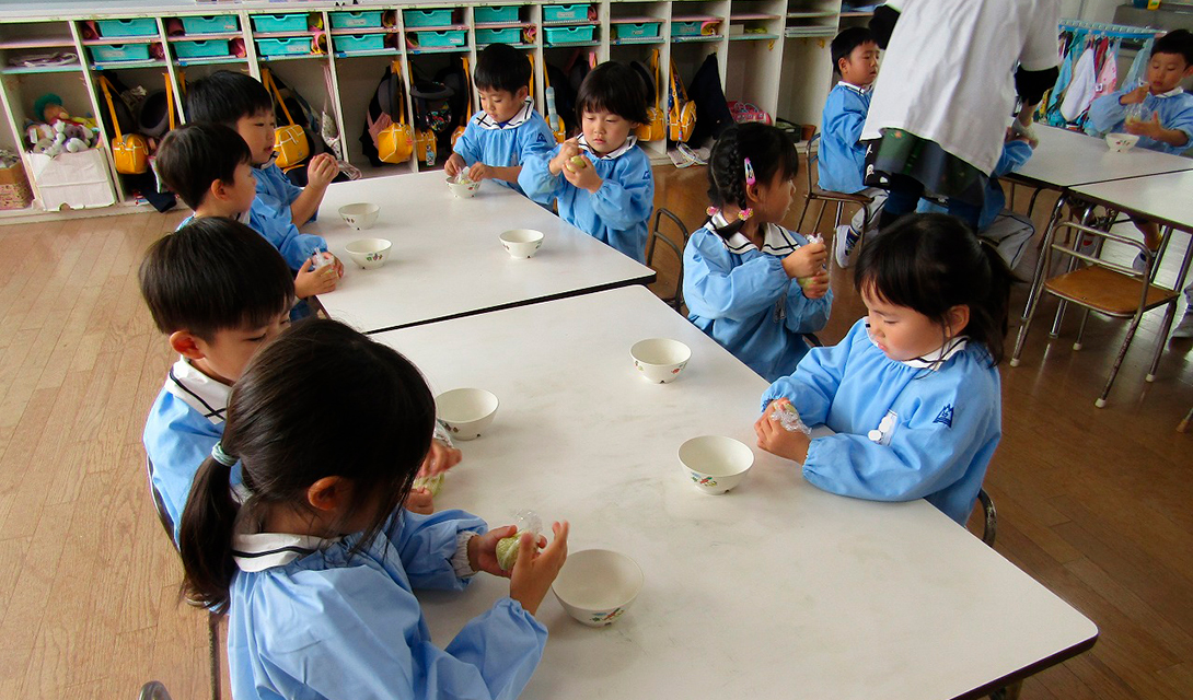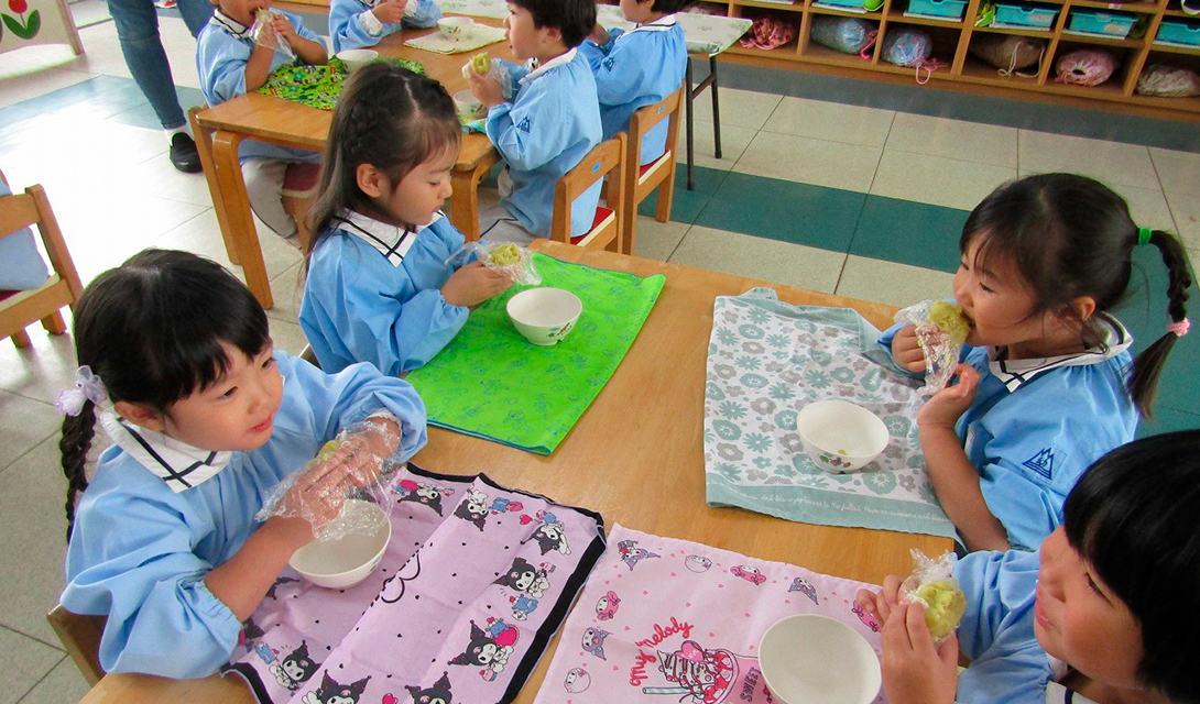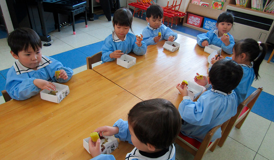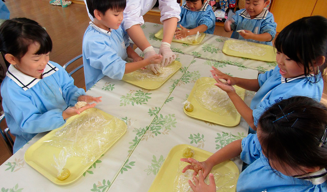 ひよこ組と年少さんは“茶巾しぼり”みんなで作ると美味しいね♪