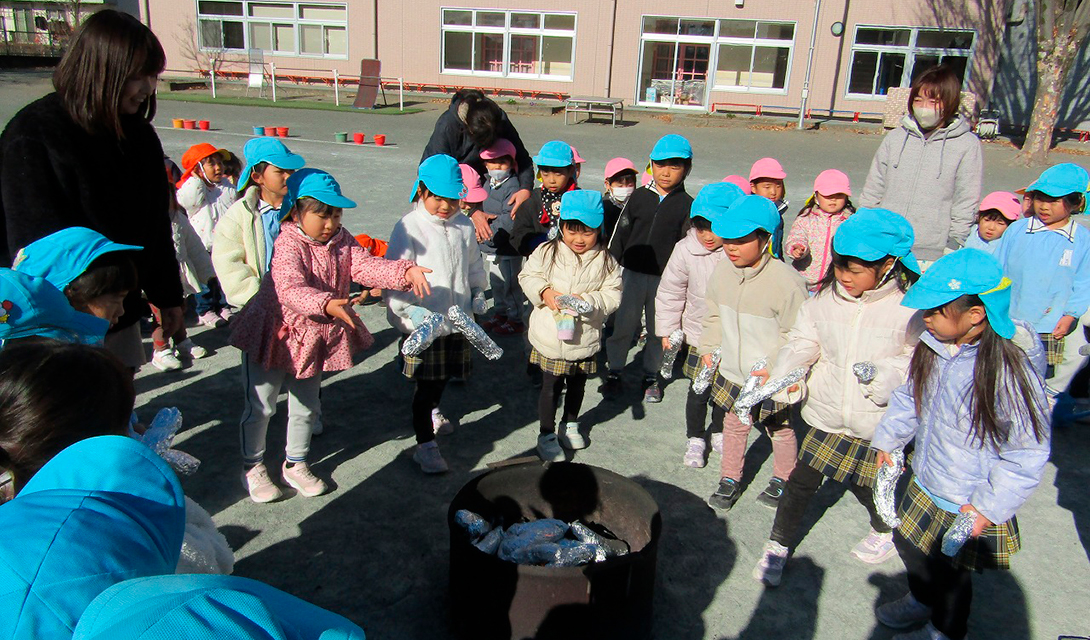 今日は,子ども達が楽しみにしていたさつまいもパーティー♪前日には、10月に収穫したさつまいもを新聞紙とアルミホイルに包んで準備をしました。さぁ、みんな始まるよ~!!
