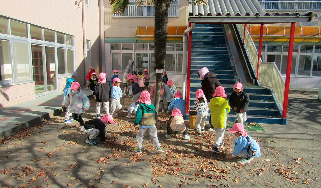 さつまいもが焼けるのを待っている間に、年中・年長さんは園長先生プロデュースのゲームをしました☆落ち葉を沢山集めてから、集めた落ち葉を2人1組になって運ぶ“落ち葉運びリレー”をしました♪