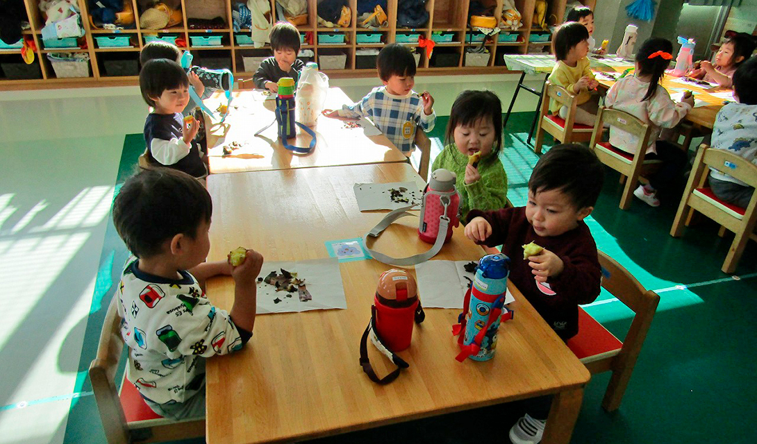 その頃ひよこ組と年少さんは、、、お部屋に戻って焼いもをモグモグ♪